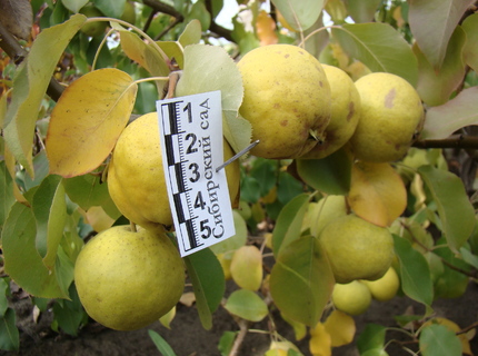 Позднеосенний сорт получен в Научно-исследовательском институте садоводства Сибири им. М.А. Лисавенко. Авторы сорта: И.А. Пучкин, И.П. Калинина, Э.П. Каратаева, М.И. Борисенко. Районирован в Западно-Сибирском и Восточно-Сибирском регионах. Деревья среднерослые, с округлой, несколько раскидистой незагущенной кроной. Побеги слегка дугообразные, коричневые. Плоды средней массой 140 г, грушевидные, бугристые, неравнобокие. Кожица гладкая, маслянистая, блестящая. Основная окраска при съеме зеленая, в состоянии потребительской зрелости – золотисто-желтая, покровная – яркий красный размытый полосатый румянец. Мякоть белая, средней плотности, колющаяся, мелкозернистая, малосочная, кисло-сладкая, хорошего вкуса. Плоды созревают к середине октября, сохраняются в холодильнике до января. Пригодны для потребления в свежем виде и переработки. Сорт вступает в плодоношение на четвертый-пятый год после посадки. Плодоносит регулярно. Сорт высокоустойчив к грибным болезням. Сорт включен в 1998г. в Госреестр по Западно-Сибирскому и Восточно-Сибирскому регионам.